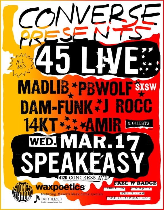 MAR. 17, 8:00 PM Stones Throw & Wax Poetics & Converse: Madlib, PB Wolf, J.Rocc, Dam-Funk, 14KT & Amir playing ALL 45s @ Speakeasy, 412 Congress Avenue, 21+